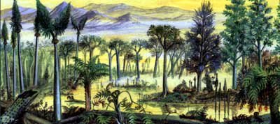 Forêt marécageuse au Carbonifère (-345 à -280 millions d’années). Source.